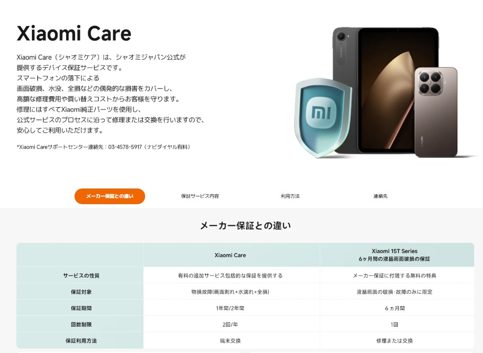 対応機種や料金の詳細については、Xiaomi Careの公式サイトで確認するよう案内されています。