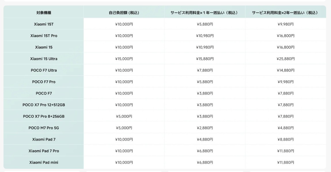 Xiaomi Careには、1年プランと2年プランが用意されており、機種ごとにサービス利用料と修理時の自己負担金が設定されています。例えばPOCO F7シリーズでは、自己負担金は税込1万円、サービス利用料は1年プランで3,880円〜、2年プランで7,880円〜となっています。