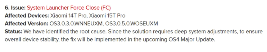 今回注目されているのは、Xiaomiが公開した最新の週間バグレポートです。その中の項目のひとつ、システムランチャーが強制終了する不具合についての対応状況において、「修正は次回のOS4メジャーアップデートで実装予定」と記載されていました。