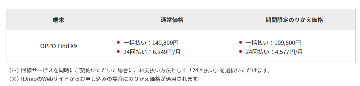 OPPO Find X9の通常価格は一括149,800円ですが、IIJmioモバイルサービス ギガプランの音声SIMまたは音声eSIMをMNPで同時申し込みした場合、期間限定のりかえ価格として一括109,800円で購入できます。差額は40,000円となり、ハイエンドモデルとしては非常に割安な設定です。