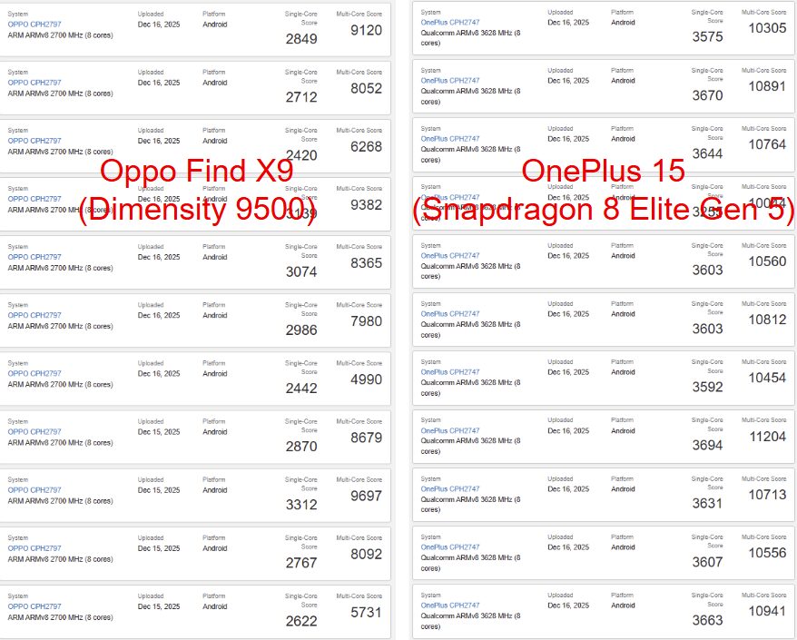 | 項目 | Oppo Find X9 (Dimensity 9500) | OnePlus 15 (Snapdragon 8 Elite Gen 5) |