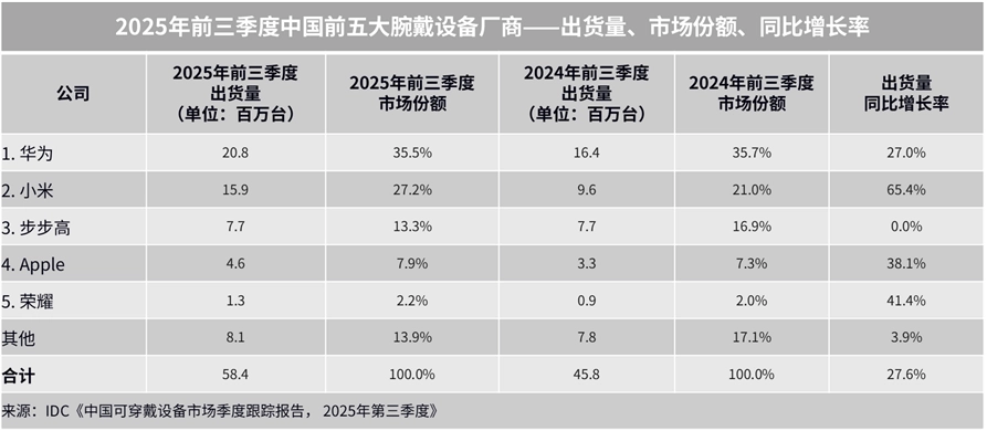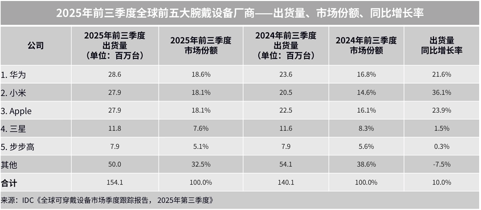 こうした流れの中で、Xiaomiは2025年最初の3四半期における累計出荷台数で世界第2位につけ、トップ5ブランドの中で最も高い成長率を記録しました。出荷台数は約2,790万台に達し、「Xiaomi Band 10」や「Redmi Watch」といった高いコストパフォーマンスと必要十分なスマート機能を備えたモデルが人気を集めています。