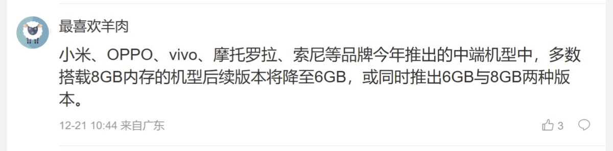 海外の情報提供者がWeiboに投稿した内容によると、今年8GB RAMを搭載していた複数のミッドレンジ機の後継モデルが、来年は6GB構成、もしくは6GBと8GBの2種類で展開される可能性があるとのことです。