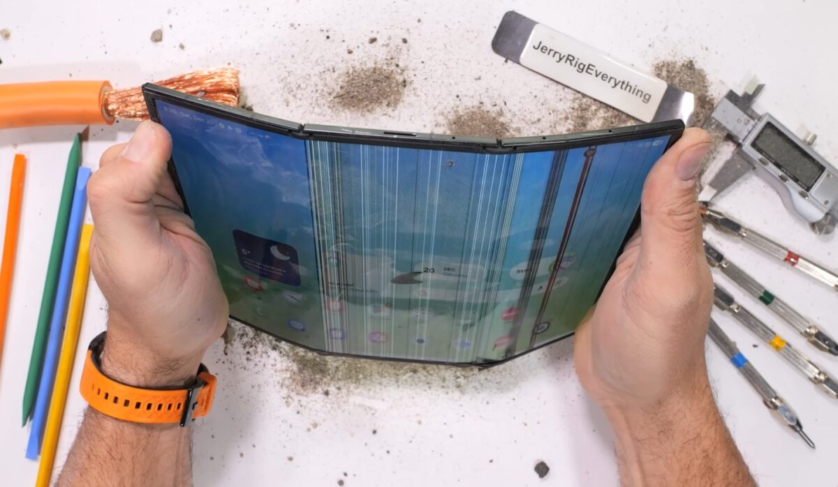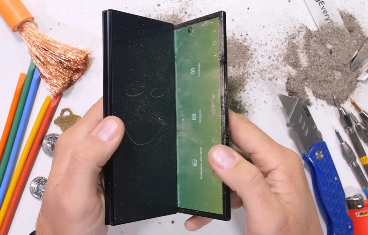 注目されたのは防塵テストです。ポケットに入り得るレベルの細かな砂を使った検証では、ヒンジ部分から異音が発生し、端末を完全に開閉する際に内部で「削れる」ような音が確認されました。三つ折り構造により可動部が増えたことで、異物の侵入に対する弱さが目立つ結果となっています。