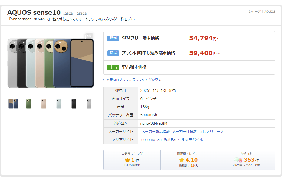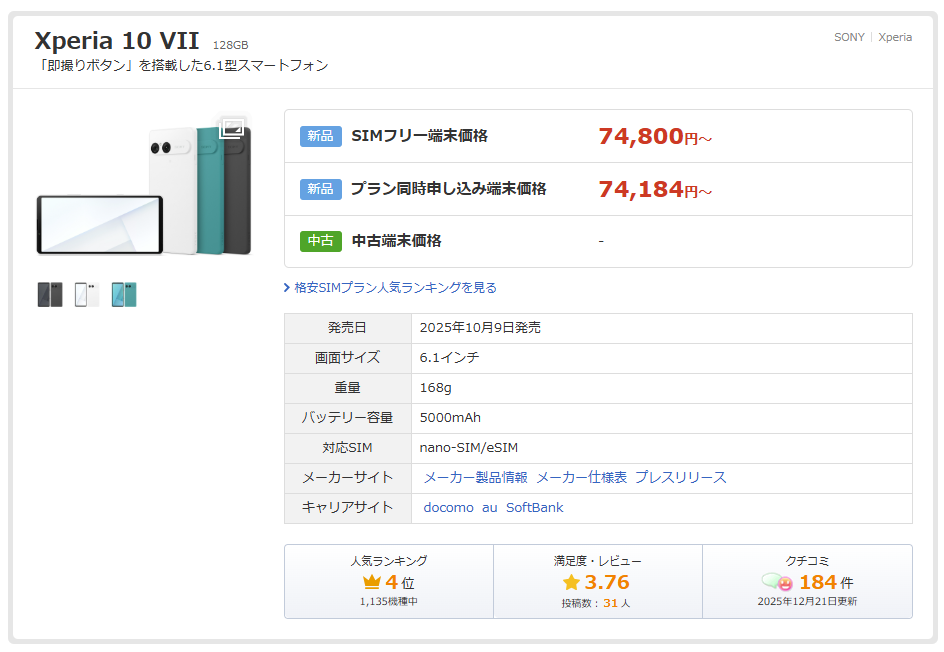 国内で直接のライバルとされる「AQUOS sense10」は、現時点での価格.com評価が4.1ポイントとなっており、発売直後はXperia 10 VIIが上回っていたものの、現在は完全に逆転されています。ミッドレンジ市場における評価の構図が、短期間で入れ替わった形です。