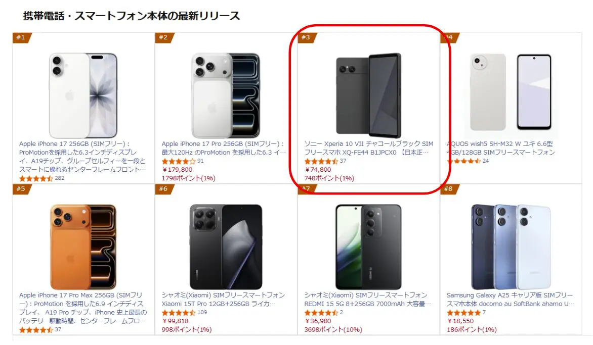 先日、Xperia 10 VIIのSIMフリー版がAmazonで全カラー再入荷したことをお伝えしました。一時的とはいえ在庫が復活したことで、購入が集中し、ランキング上昇につながった可能性も考えられます。