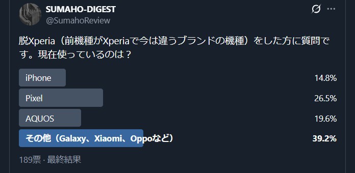 注目すべきは、「その他(Galaxy、Xiaomi、Oppoなど)」が39.2%と4割近くを占めている点です。具体的な内訳は不明ですが、XperiaユーザーがGalaxyやXiaomi、Oppo、Motorolaといった特定のブランドに一斉に集中して移行するとは考えにくく、実際にはかなり幅広いブランドへ分散して移行している可能性が高そうです。