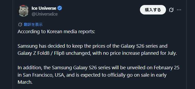 報道によれば、サムスンはGalaxy S26シリーズの販売価格をGalaxy S25シリーズと同水準に据え置く方針を固めたとされています。半導体やメモリ価格の上昇、為替の影響などから業界全体では値上げが予想されていましたが、サムスンは自社の利益率を抑える形で価格上昇を回避する選択をしたようです。