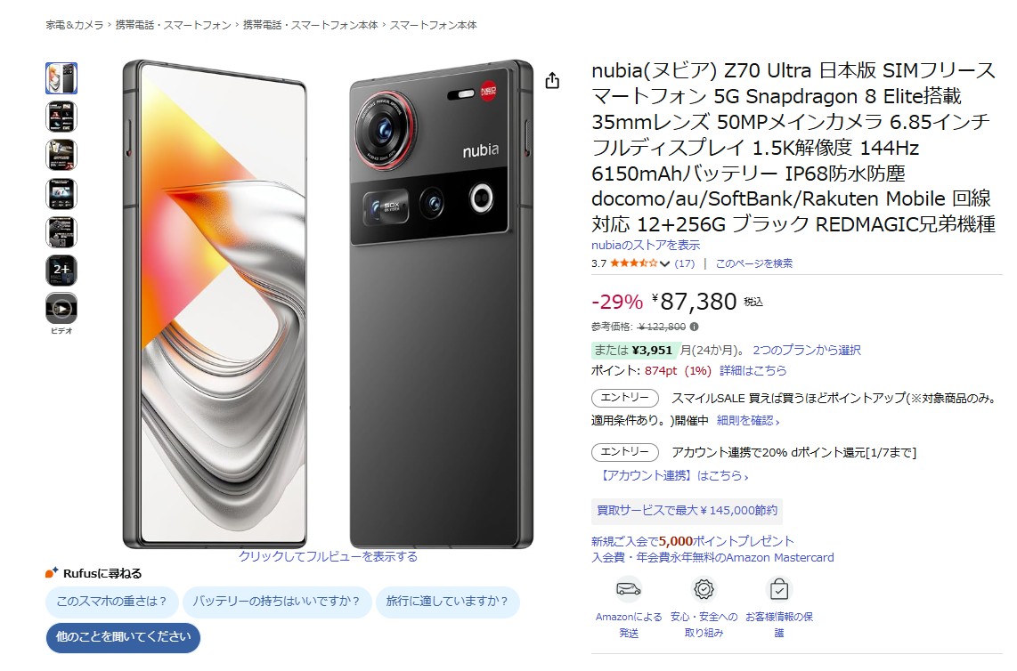 通常価格122,800円のnubia Z70 Ultraが、35,420円オフの87,380円で購入できる今回のセールは、明らかに“買い時”と言える内容です。