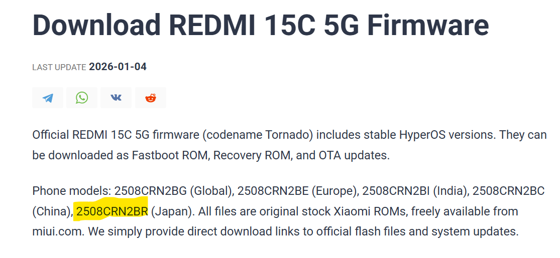 今回確認された情報は、Xiaomi製スマートフォンのファームウェアを継続的に追跡している「MI UI ROM」に掲載されているものです。そこには、Redmi Note 15 Proに限って、日本向けとみられる末尾「R」の型番「25080RABDR」が記載されていました。