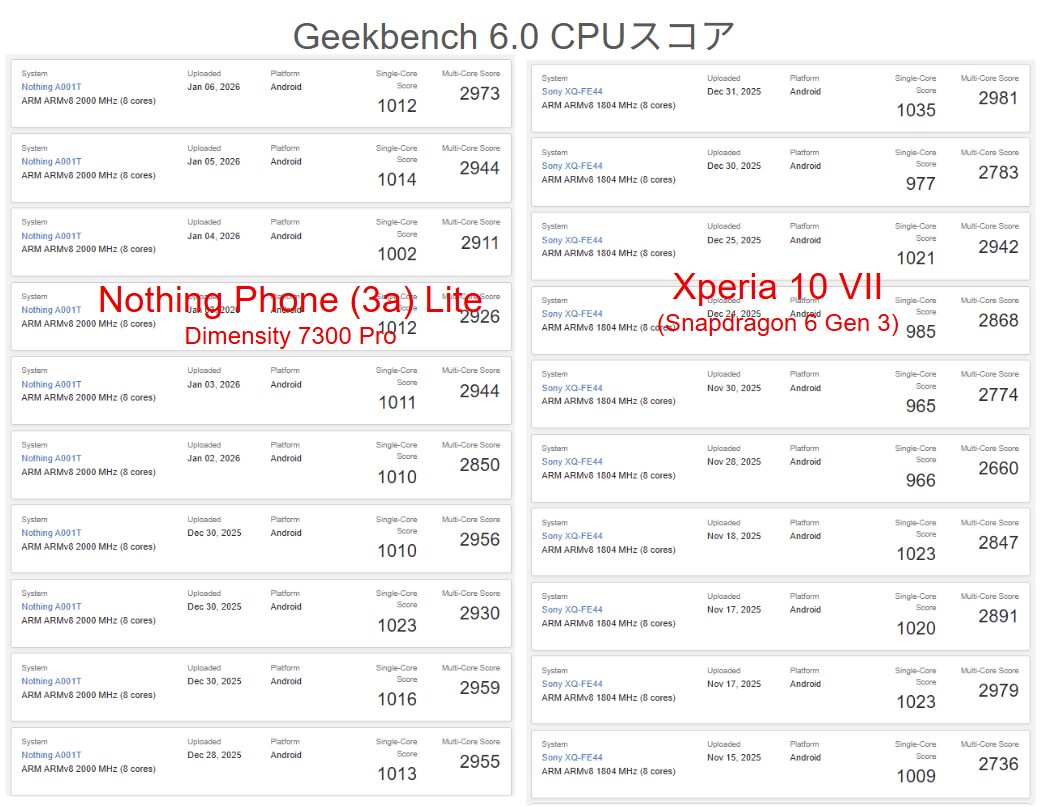 Nothing Phone (3a) LiteはDimensity 7300 Pro、Xperia 10 VIIはSnapdragon 6 Gen 3を搭載しています。