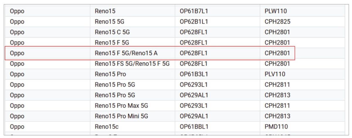これまで、ソフトバンク版、au版、SIMフリー版とみられるOPPO Reno15 Aの型番がケース関連情報から確認されていましたが、今回あらためてGoogle Playの対応機種データベース上において、「CPH2801」という型番がReno15 F 5GとReno15 Aの両方に紐づいていることが確認されました。