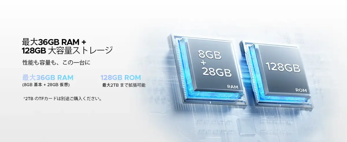 Tab G6 Proは36GBの仮想RAM+128GBストレージを搭載。複数アプリを同時に起動しても動作が重くならず、動画編集や軽量ゲームもスムーズに楽しめます。MediaTek Helio G100オクタコアプロセッサとMali-G52 MC2 GPUにより、マルチウィンドウ作業も快適です。microSDカードスロットを使えば最大2TBまで拡張可能です。