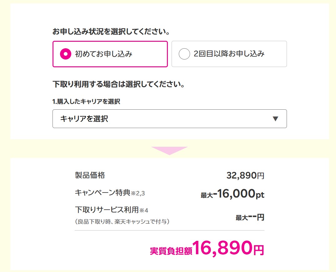 さらに楽天モバイルでは、他社からの乗り換えで「Rakuten最強プラン」または「Rakuten最強U-NEXT」を初めて契約した場合、最大1万6000ポイントの楽天ポイントを還元します。条件を満たせば、実質価格は1万6890円となり、ミッドレンジスマートフォンとしては異例とも言える水準です。
