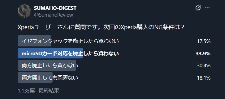 Xperiaユーザーを対象に、「次回Xperiaを購入する際のNG条件」を尋ねたアンケート結果が公開されました。設問はイヤフォンジャックとmicroSDカードスロットの存廃に焦点を当てたもので、現在のスマートフォン市場を考えると興味深い内容となっています。
