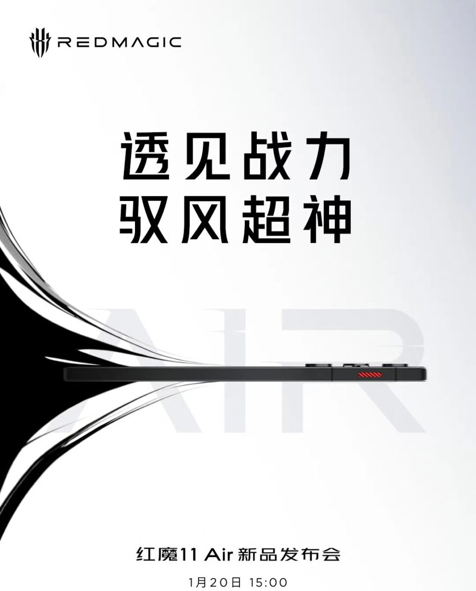 公開された公式ポスターでは、Red Magic 11 Airの側面デザインが確認できます。フラット形状のサイドフレームに加え、シリーズの象徴とも言える赤いキーを搭載。背面カメラの出っ張りは最小限に抑えられており、薄型モデルらしいすっきりとした印象を与えています。