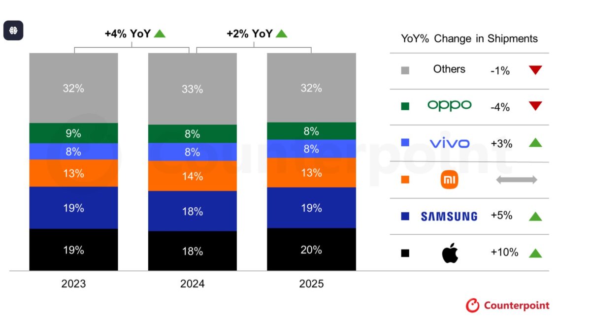 2025年の世界スマートフォン市場は、長らく続いた停滞局面を抜け出し、緩やかな回復基調を見せました。調査会社Counterpoint Researchによると、年間出荷台数は前年から2%増加し、市場全体としては小幅ながらも持ち直しの兆しが確認されています。