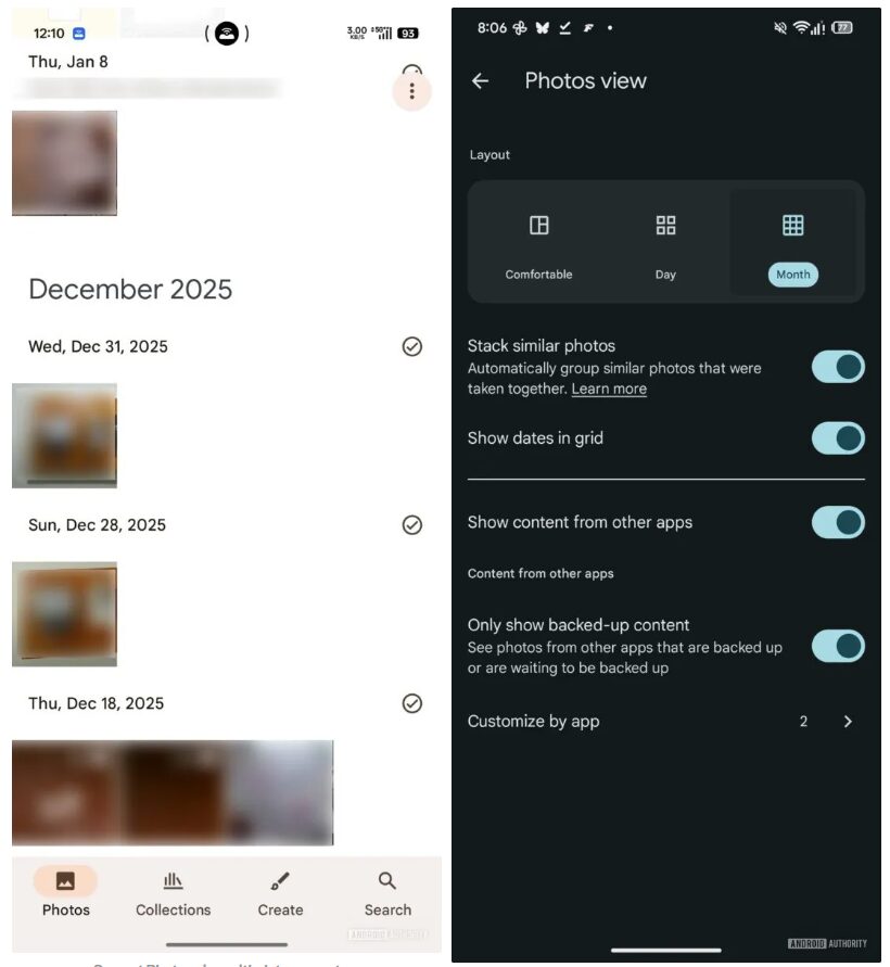 もう一つ注目されているのが、写真一覧画面の表示方法を変更する機能です。新たに追加されるとみられる設定では、写真グリッド上に表示されている日付ラベルを非表示にできるようになります。