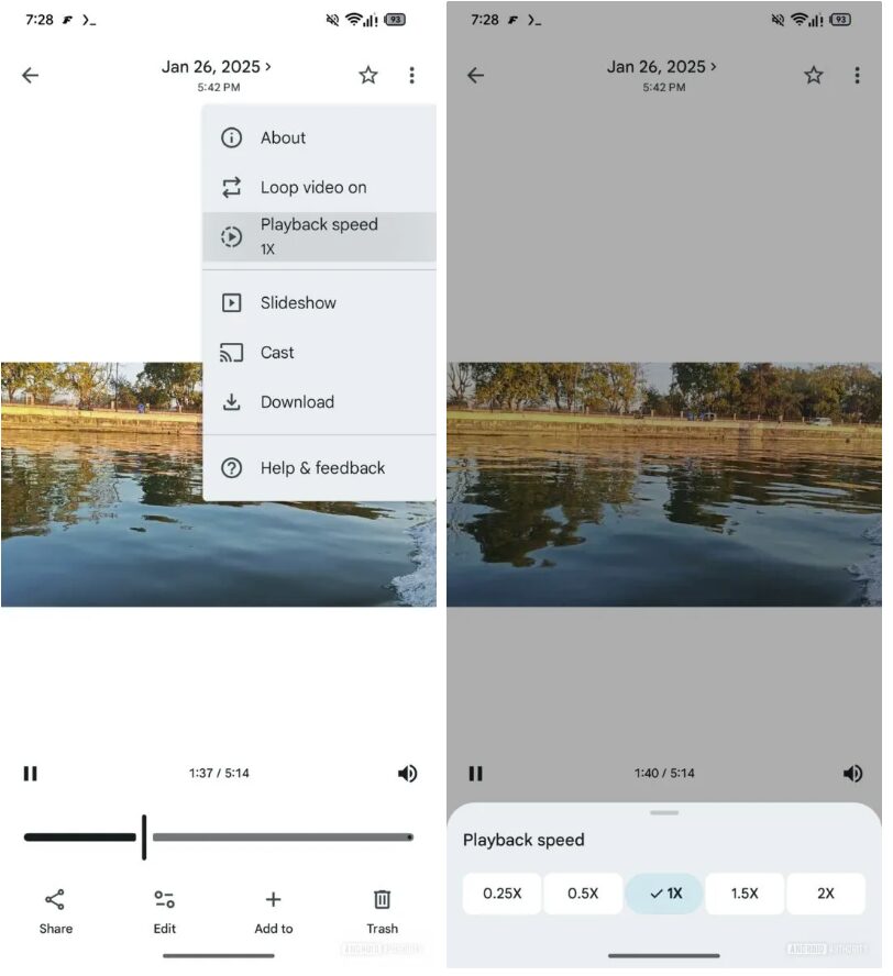 確認されたのは、Googleフォトのバージョン7.58に含まれる未公開機能です。動画再生中に右上のメニューから「再生速度」を選択すると、0.25倍、0.5倍、1倍、1.5倍、2倍といった複数の速度を切り替えられる仕組みになるとみられています。