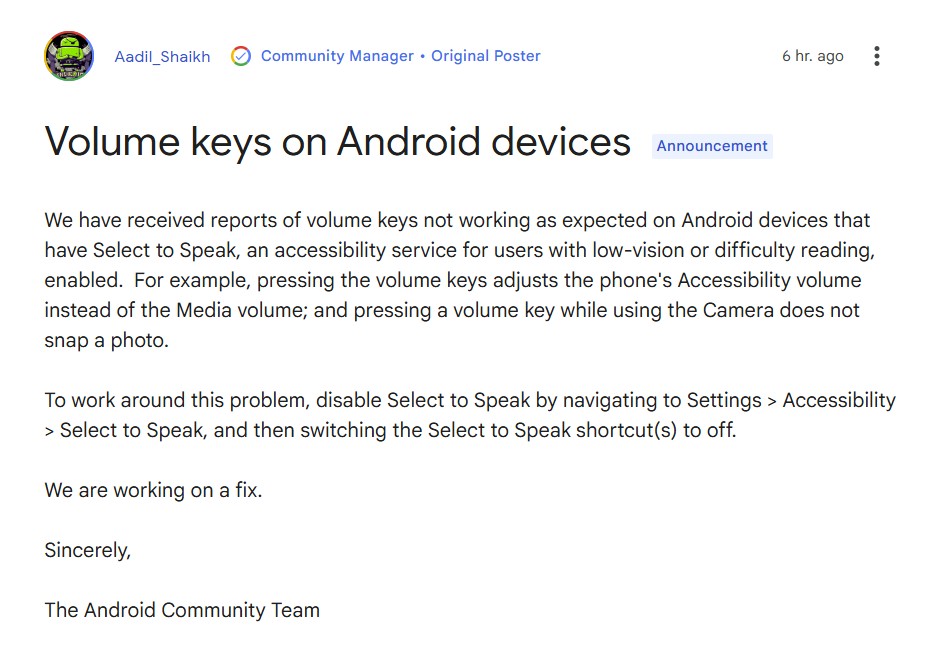 Android端末で音量キーが正しく動作しない不具合について、Googleが問題を認識し、修正に取り組んでいることを明らかにしました。現在のところ、特定のアクセシビリティ機能を利用している環境で発生しているようです。