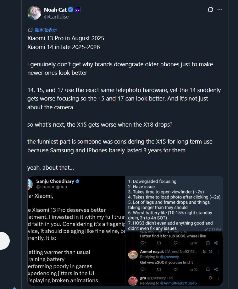 複数の投稿で共通して挙げられているのが、カメラ性能の変化です。あるユーザーは、Xiaomi 14がOSアップデート後にピント精度の低下やフォーカスの不安定さを感じるようになったと指摘しています。Xiaomi 14、15、17シリーズで同一の望遠カメラハードウェアを採用しているにもかかわらず、旧モデルだけが性能低下しているように見える点に疑問を呈する声もあります。