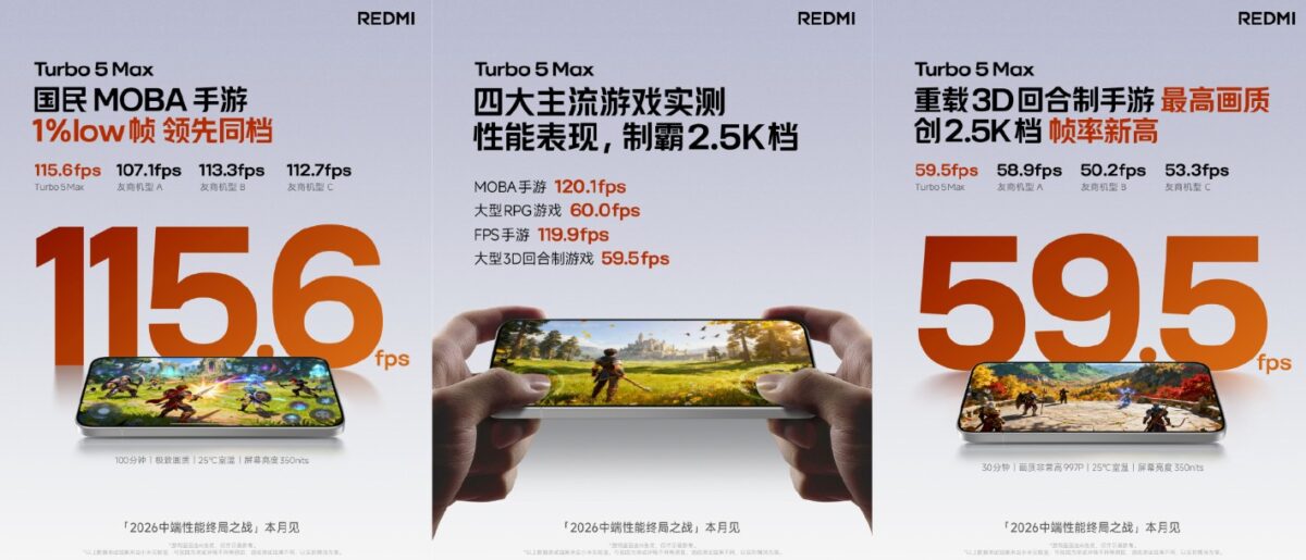 POCO X8 Pro Maxは、複数ジャンルのゲームでもテストが行われています。公開されたデータによると、MOBAタイトルで平均120.1fps、FPSゲームで119.9fps、大規模RPGで60.0fps、大規模3Dターン制ゲームで59.5fpsという結果でした。