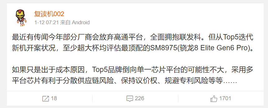 中国SNSのWeiboで情報を発信しているリーカー「Repeater 002」によると、世界のAndroidスマートフォン出荷台数で上位に位置する5社は、最上位フラッグシップにSnapdragon 8 Elite Gen 6 Proを引き続き採用する見込みだとされています。
