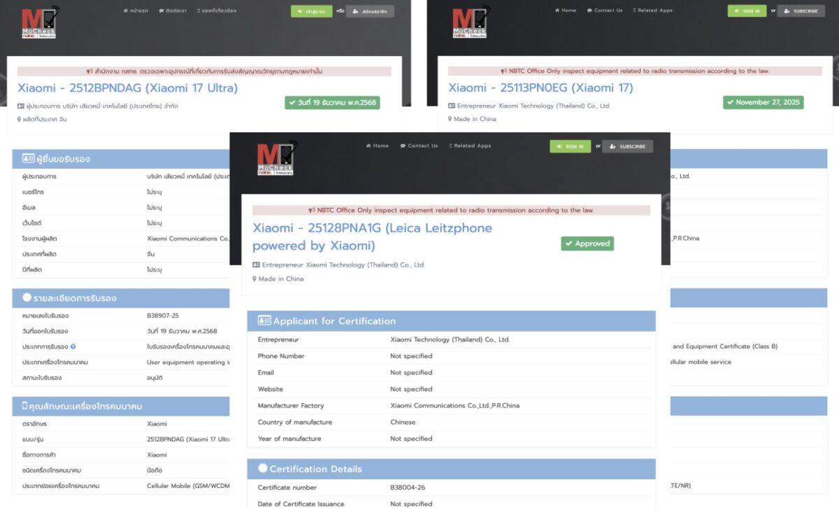 さらに、著名リーカーのEvan Blass氏によると、タイの認証機関であるNBTCにおいて、グローバル展開予定のXiaomiフラッグシップ3機種が確認されたとのことです。