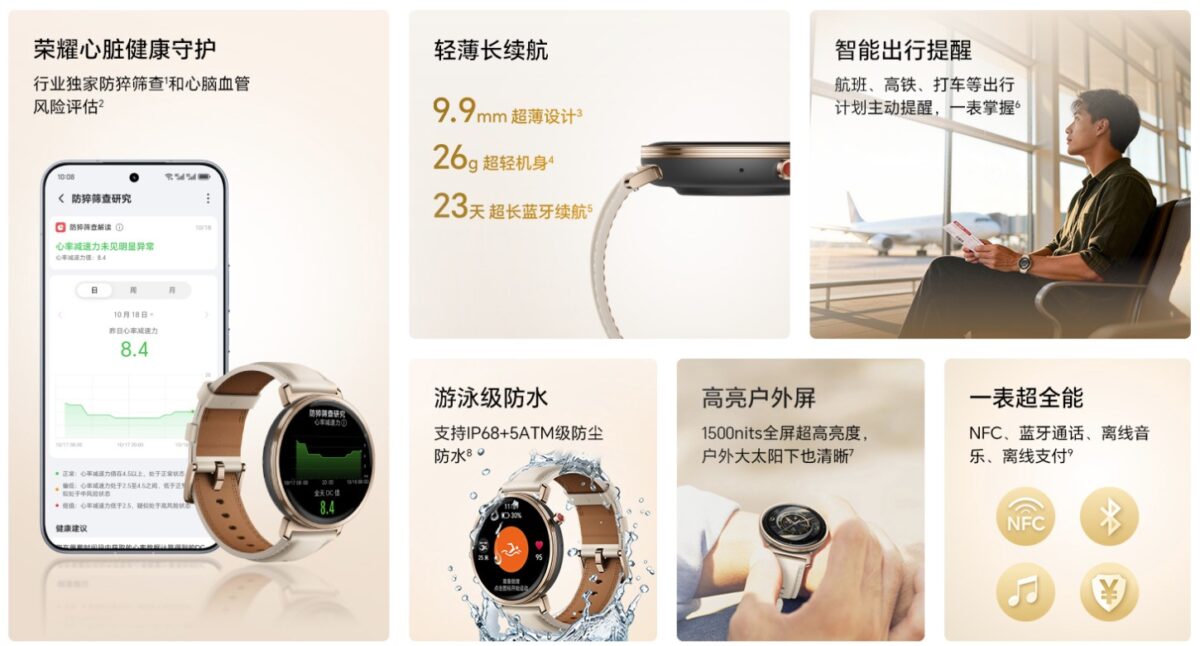 Honor Watch GS 5は、厚さ9.9mm、重量26gという軽量・薄型設計を採用しています。アルミ合金製ベゼルと本革ストラップの組み合わせにより、価格帯以上の上質感を演出しています。
