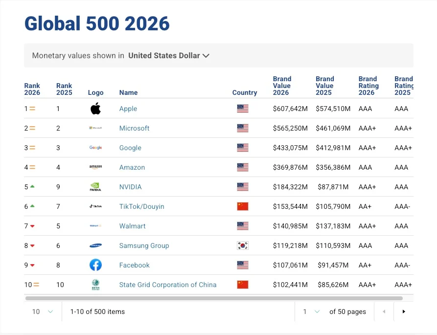 Brand Financeのランキングによると、Appleは前年に続きトップの座を維持しました。ブランド価値はさらに上昇しており、その存在感は依然として突出しています。