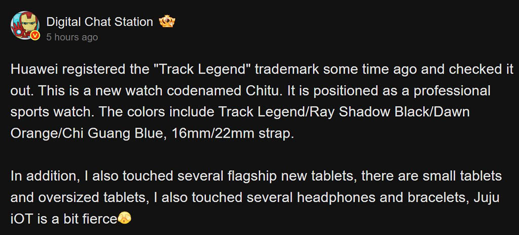 情報をもたらしたのは、Weiboで知られるリーカーのDigitalChatStation氏です。それによると、この新型スマートウォッチの開発コードネームは「Chitu」とされており、スポーティーな4色のカラーバリエーションが用意される見込みです。