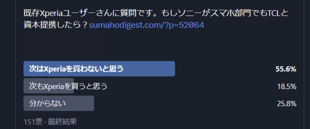 当サイトがX上で実施したアンケートでは、「もしソニーがスマホ部門でもTCLと資本提携したらどう思うか」という問いに対し、過半数にあたる55.6%が「次はXperiaを買わないと思う」と回答しました。