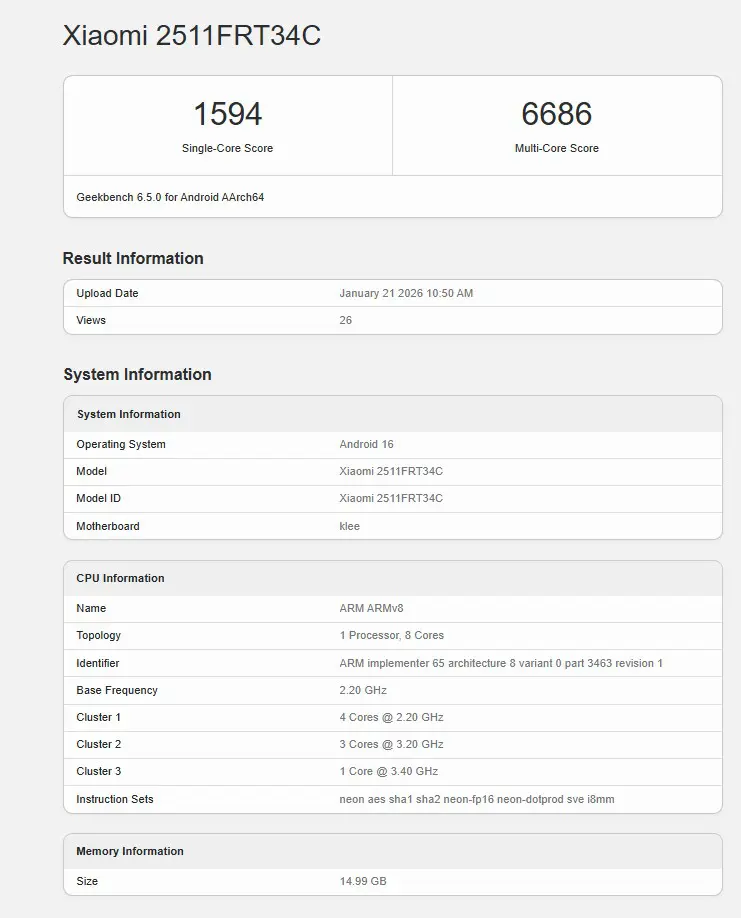 Geekbenchの計測結果によると、Redmi Turbo 5にはMediaTekの最新SoC「Dimensity 8500」が採用されています。このチップは発表からまだ1週間も経っておらず、昨年末に出回っていた噂が正しかった形です。