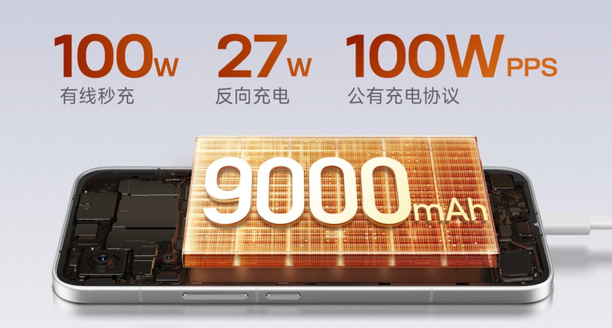 バッテリー容量は9000mAhと非常に大きく、100WのPPS対応有線急速充電をサポートします。さらに、27Wの有線リバース充電にも対応しており、他のデバイスへ給電する用途にも活用できます。大容量と高速充電を両立した構成は、ハイエンド寄りの仕様と言えるでしょう。