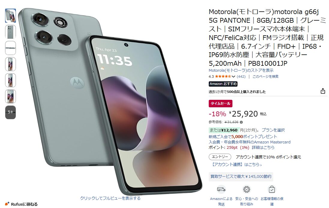 Motorola(モトローラ)のミドルレンジスマートフォン「moto g66j 5G」が、Amazonのタイムセールに登場しています。