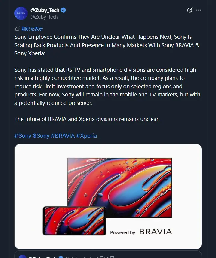 この投稿は、ソニーが先日発表したホームエンターテインメント部門でのTCLとの提携・事業再編を受けた文脈で発信されたもので、Xperia事業も同様に「選択と集中」の対象になっている可能性があるとして注目を集めました。