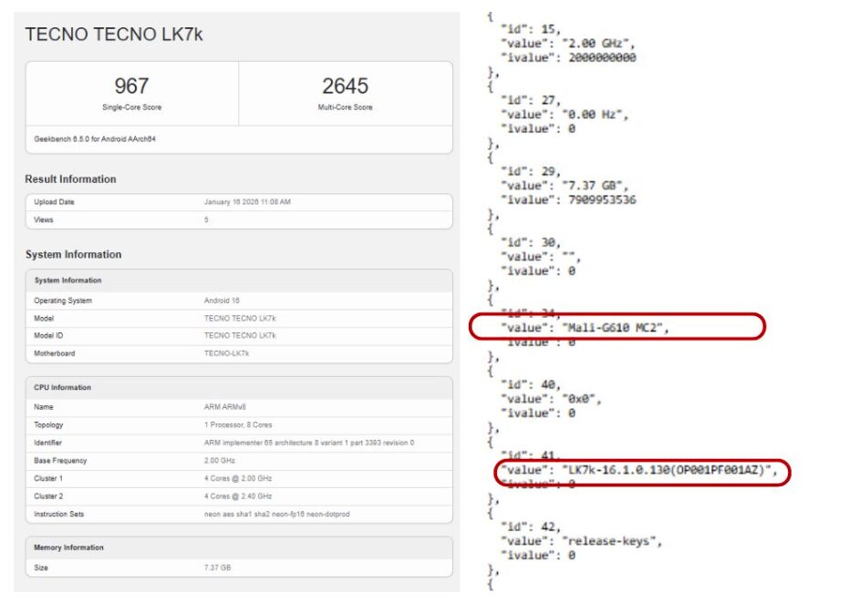 Geekbenchのデータベースには、同じく「LK7k」という型番で端末が登録されており、シングルコア967、マルチコア2645というスコアを記録しています。OSはAndroid 16を搭載しており、GPUにはMali-G610 MC2が使われていることも確認されています。