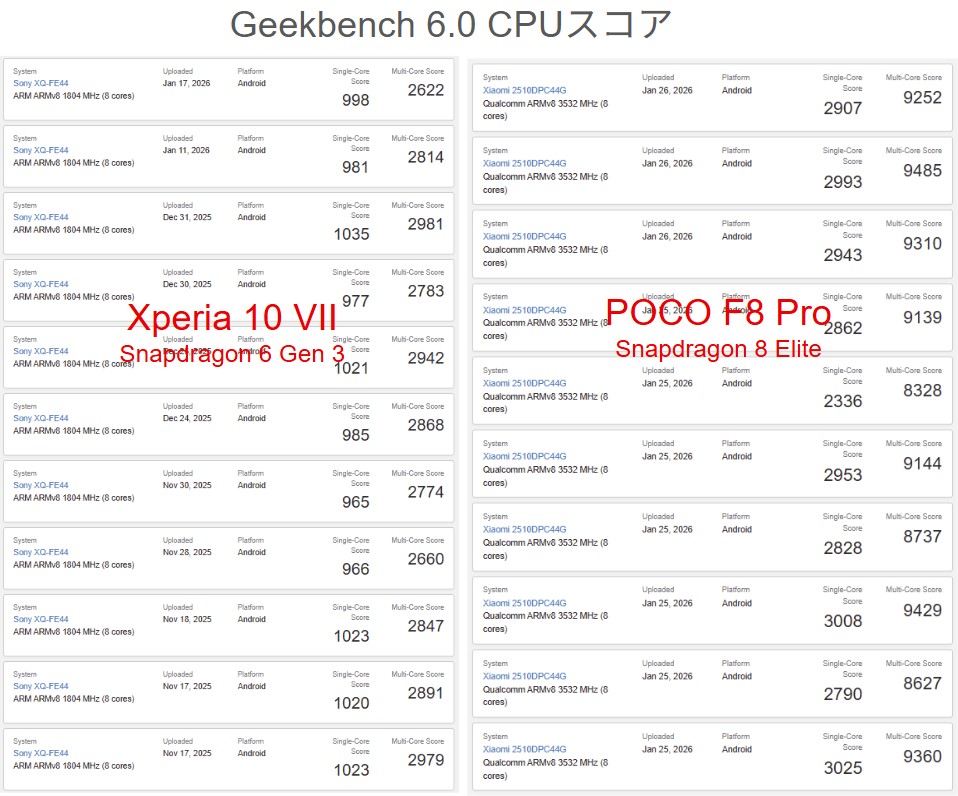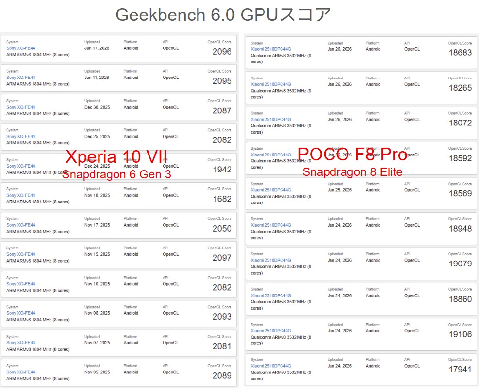 実際、POCO F8 Proは同じSnapdragon 8 Eliteを搭載するソニーのフラッグシップ「Xperia 1 VII」と比較しても、ベンチマークスコアでは上回るケースがあり、しかも価格は半分以下という事実があります。