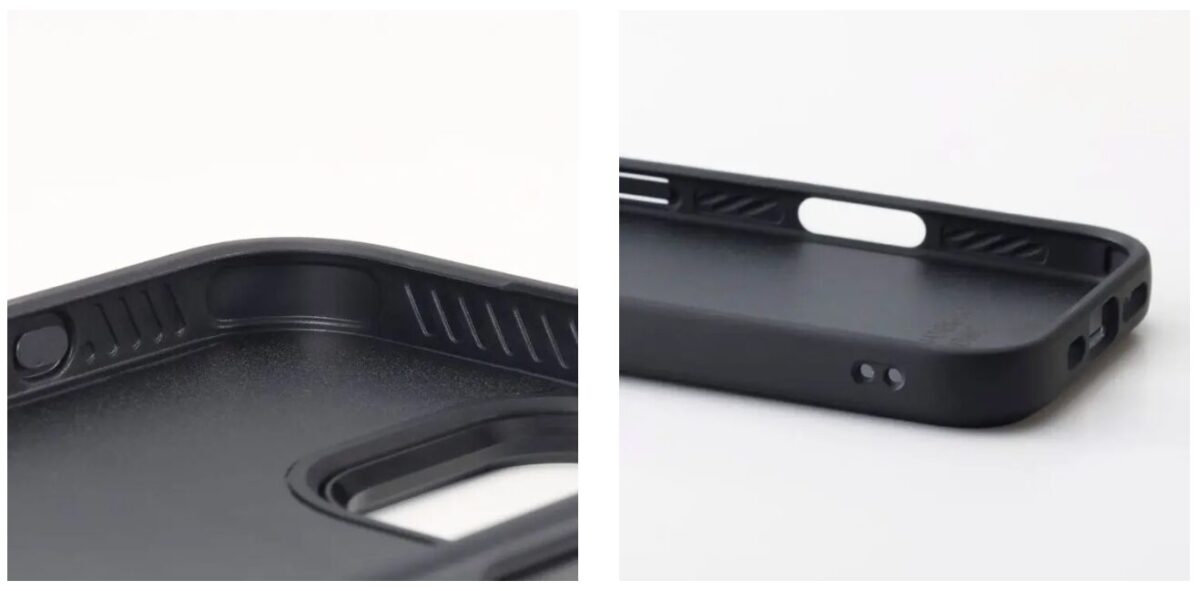 iPhone 16対応モデルは、カメラ周囲を囲むフチ高設計を採用し、机に置いた際にレンズが直接触れにくい構造となっています。カメラコントロールボタンは、指の腹でも押しやすい凹形状のオリジナル設計です。