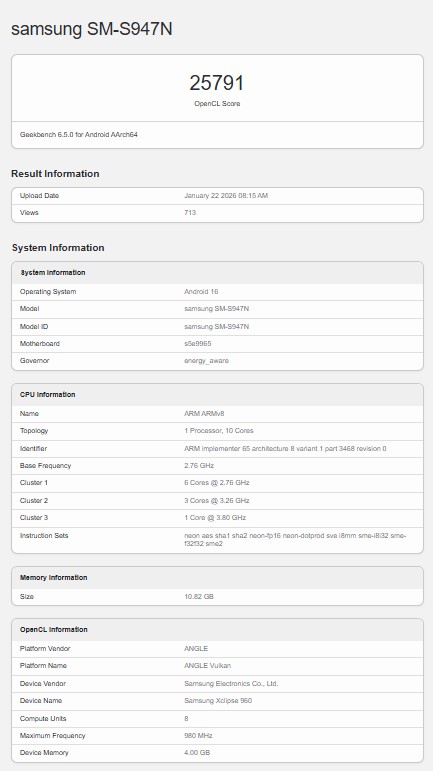 その影響もあり、OpenCLスコアは約15,600と、Exynos 2600搭載機で確認されている約25,000前後の数値を大きく下回っています。ただし、今回のスコアはあくまで初期段階のものであり、最終的な性能を示すものではありません。