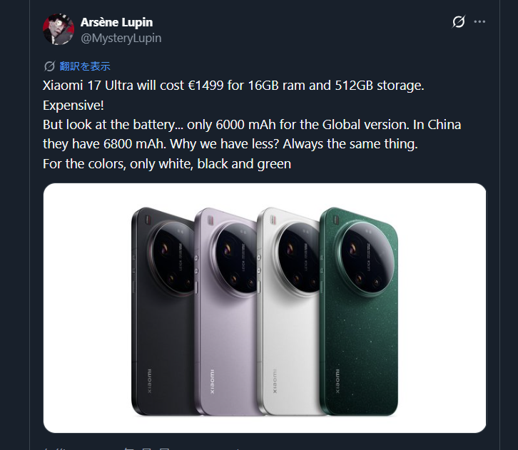 Xiaomiが国内でのリリースも間接的に認めたXiaomi 17シリーズですが、その最上位モデルとなるXiaomi 17 Ultraに関する新たな情報が明らかになりました。信頼性の高いリーカーにより、グローバル向けの価格設定やバッテリー容量、カラーバリエーションなどが伝えられています。