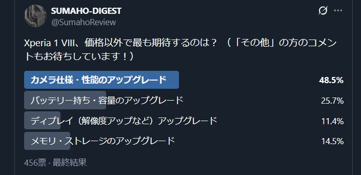 当サイトがX上で実施したアンケート「次世代Xperiaフラッグシップ、Xperia 1 VIIIに価格以外で最も期待する点は?」の結果がまとまりました。456票が集まった今回の調査からは、Xperiaユーザーが次期モデルに何を望んでいるのか、その優先順位がはっきりと見えてきます。