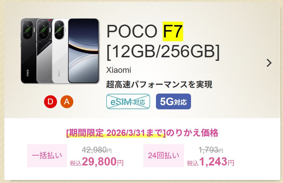 | POCO F7 Pro [12GB/256GB] | 一括:49,800円(税込) 24回:2,076円(税込) |