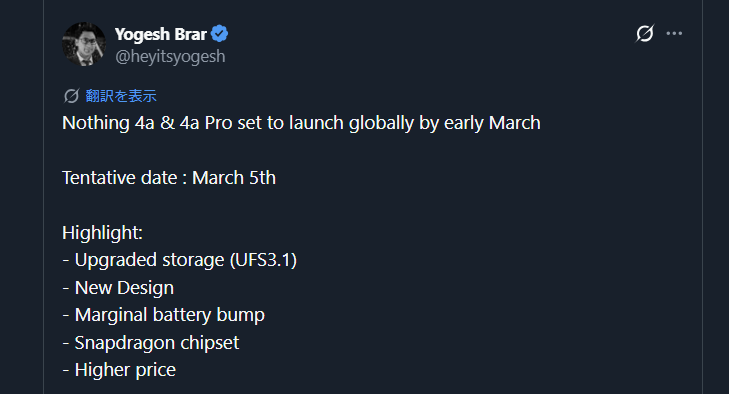 発表時期が3月とされていることから、Nothingが近くティザーや正式な発表日を告知する可能性は高そうです。フラッグシップ不在の年に投入されるPhone 4aシリーズが、どこまで完成度を高めてくるのか、今後の動向が注目されます。
