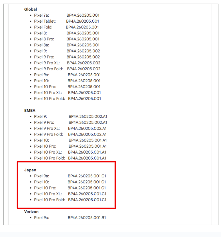 アップデートのビルド番号は地域ごとに異なっており、日本向けモデルには末尾が「C1」となる専用ビルドが用意されています。また、EMEA(欧州)やVerizon向けにも、それぞれ異なるビルドが提供されています。