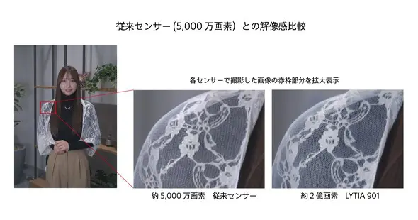 LYTIA 901は、1/1.12型の積層型CMOSイメージセンサーで、有効画素数は約2億画素に達します。最大の特徴は、業界初とされるAI処理回路をセンサー内部に直接搭載している点です。