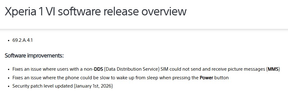Xperia 1 VIでは、2026年1月29日付でソフトウェアバージョン「69.2.A.4.1」が配信されています。今回のアップデートで特に注目されるのが、スリープ状態からの復帰に関する不具合の修正です。