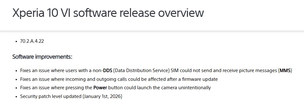 Xperia 10 VI向けには、同日付でソフトウェアバージョン「70.2.A.4.22」が配信されています。こちらでは、通話機能に関わる不具合の修正が主な改善点となっています。
