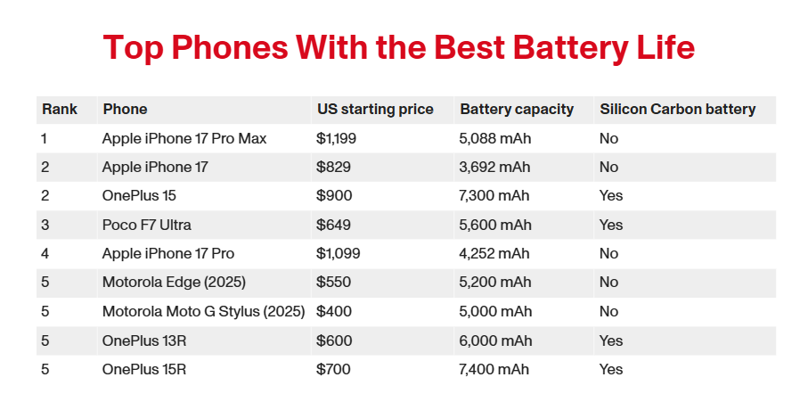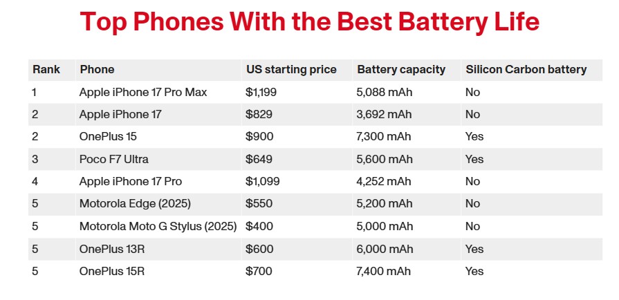 続く2位にはiPhone 17とOnePlus 15が並びました。特にiPhone 17は、上位機種の中で最小クラスのバッテリー容量ながら高い持続時間を示しており、Appleの省電力設計が際立つ形です。