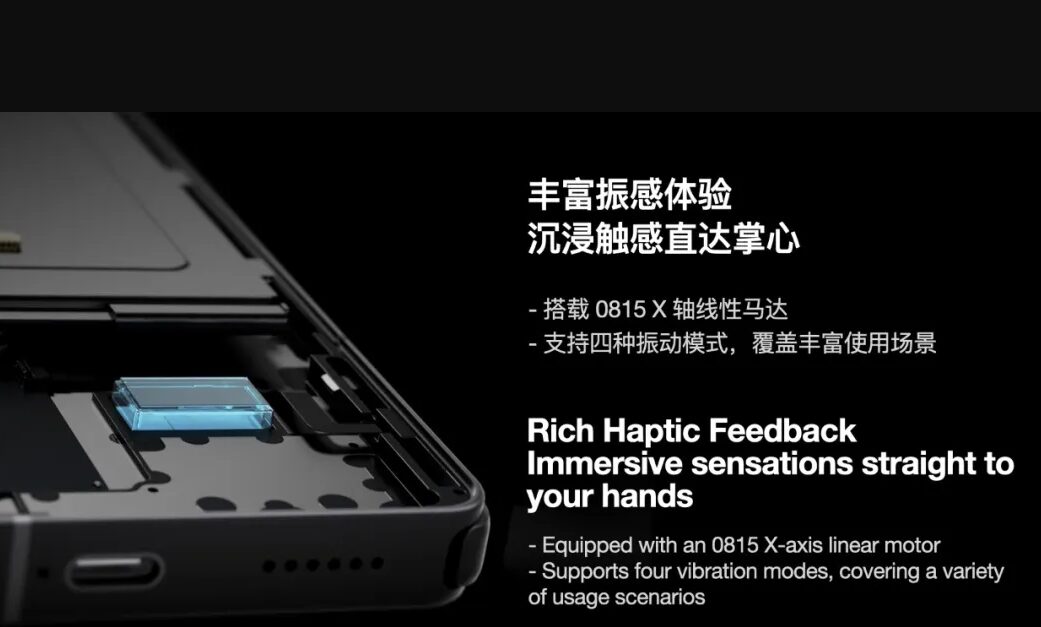 新たに明らかになった仕様の一つが、0815 X軸リニアモーターの搭載です。4種類の振動モードに対応し、ゲームプレイ時の没入感を高めるとしています。